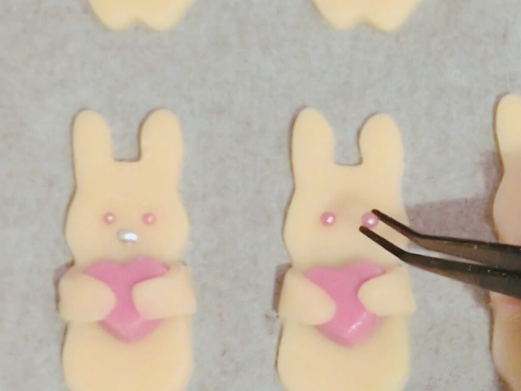 3. トッピングで顔を作る 焼く前に、アラザンで目や鼻を付けます。 ここで面白い発見がありました!子どもたちは手が小さいので、小さなアラザンも指先で器用に置いていくのですが、大人の手だとなかなか難しくて(笑)💦 私は細かい作業がしやすいように「ピンセット」を使って仕上げました。今回はアラザンにしましたが、焼き上がった後にチョコペンで顔を仕上げるのも良いと思います。