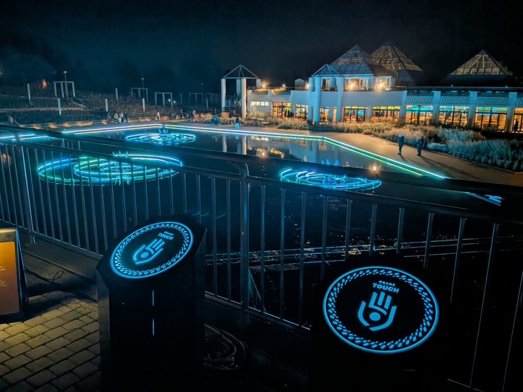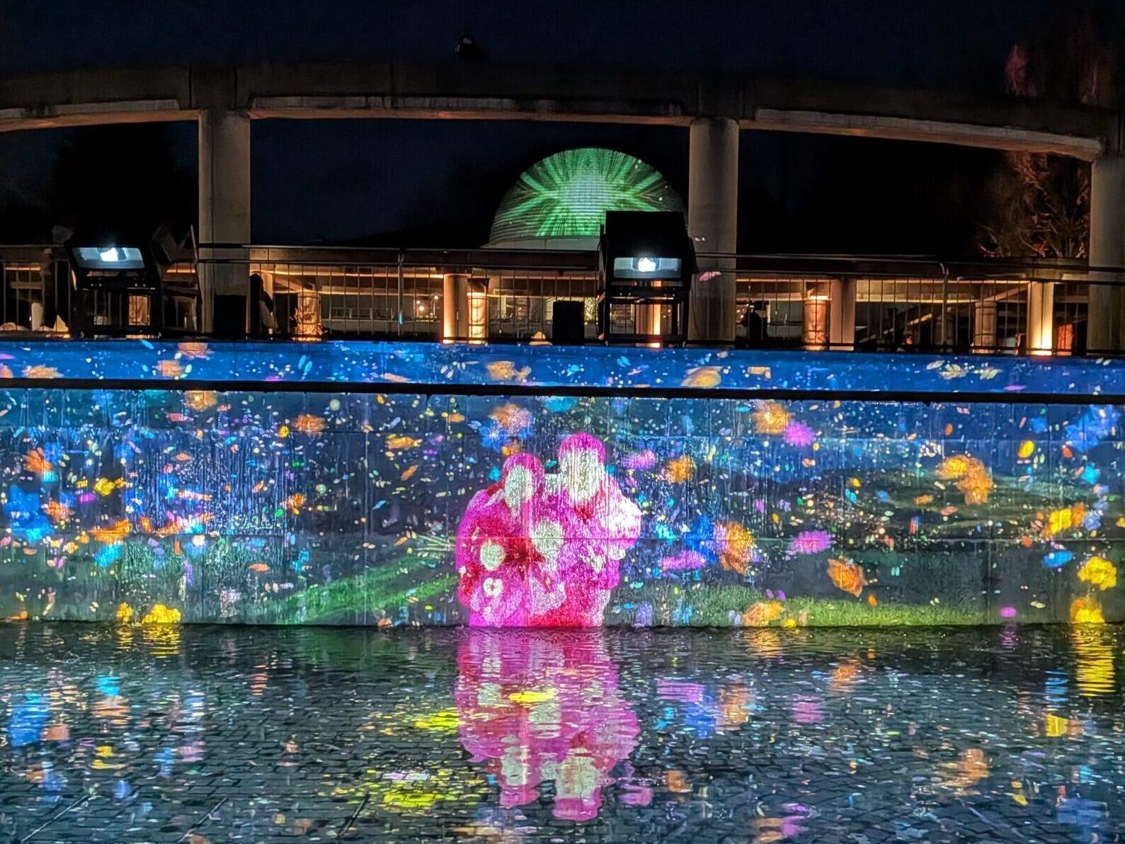 ここはフォトボックスで撮った自分たちの姿が、水辺の壁面にアートとして映し出される仕掛けです。フォトボックスは水辺の左右に2台あります。私たちはフォトボックスのところに列が出来ていたのですぐに見つけられましたが、暗くなってくると見つけづらいので注意⚠️